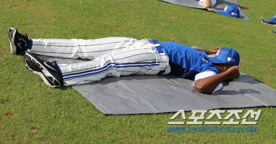 괌 햇빛은 따가워.' 삼성 새 외국인 선수 피가로가 25일 괌 레오팔레스리조트에서 열린 전지훈련에 합류해 처음으로 동료들과 함께 스트레칭을 하고 있다. 정면으로 내리쬐는 햇빛에 눈이 부셨는지 모자로 얼굴을 가리기도 했다.