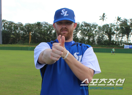 삼성 라이온즈 새 외국인 투수 타일러 클로이드가 25일 괌 레오팔레스리조트에서 가진 전지훈련에 처음 참가해 엄지를 치켜드는 스트레칭을 하고 있다. 클로이드는 올시즌 총액 65만달러에 삼성과 계약했다.