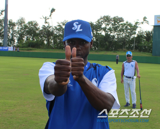 삼성 라이온즈 새 외국인 투수 알프레드 피가로가 25일 괌 레오팔레스리조트에서 가진 전지훈련에 처음 참가해 엄지를 치켜드는 스트레칭을 하고 있다. 강속구 투수인 피가로는 지난 2011년 일본 오릭스 버팔로스에서 이승엽과 한솥밥을 먹은 적 있다.