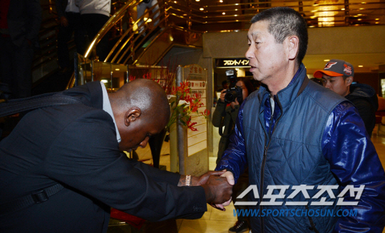 한화 이글스 외국인 선수 3인방이 일본 고치 전훈캠프에 합류했다. 25일 저녁 한화의 스프링캠프가 펼쳐지고 있는 일본 고치의 선수단 숙소에 도착한 나이저 모건이 김성근 감독과 악수를 하며 인사를 나누고 있다. 쉐인 유먼과 나이저 모건은 지난 24일, 미치 탈보트는 25일 각각 한국에 도착했고 오늘 인천공항을 통해 스프링캠프지인 일본 고치로 이동했다. 고치(일본)=허상욱 기자 wook@sportschosun.com/2015.01.25/