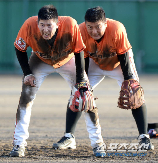 한화 이글스의 김회성(왼쪽)과 김태균의 입에서 나지막한 신음 소리가 흐른다. 이유는 다름 아닌 김성근표 '지옥의 펑고' 훈련 때문이다. 일흔이 넘은 김성근 감독이지만 젊은 코치도 하기 힘들다는 500개의 볼을 선수들을 향해 날렸다. 물론 김회성과 김태균의 입에서는 500번의 앓는 소리가 새어 나왔다. 한화의 일본 전지훈련지인 고치는 영화 '실미도'에서나 볼법한 장면들이 매일 연출되고 있다.고치(일본)=허상욱 기자 wook@sportschosun.com/2015.01.24/