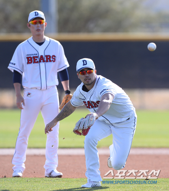 두산 베어스 선수단이 미국 애리조나 피오리아 스포츠 콤플렉스에서 전지훈련을 실시 했다. 두산은 1월 16일- 2월 16일까지는 미국 애리조나 피닉스 피오리아에서 1차 캠프를 진행한다. 두산 선수들이 수비 전술 훈련를 펼쳤다. 루 수비에 임하고 있는 오재원. 피오리아(미국 애리조나)송정헌 기자 songs@sportschosun.com/2015.01.22