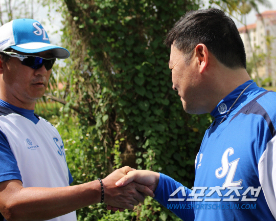 삼성 라이온즈 포수 진갑용이 27일 팀의 괌 전지훈련에 합류해 김태한 투수코치와 반갑게 악수를 하고 있다. 삼성은 1차 전훈지인 괌에서 2월 1일까지 체력과 전술 훈련을 할 예정이다. 2월 2일 일시 귀국해 가족과 하루를 쉰 후 2월 4일 다시 2차 전훈지인 일본 오키나와로 재출국한다. 선수단은 3월 4일 귀국할 예정이다. 괌=권인하 기자 indyk@sportschosun.com