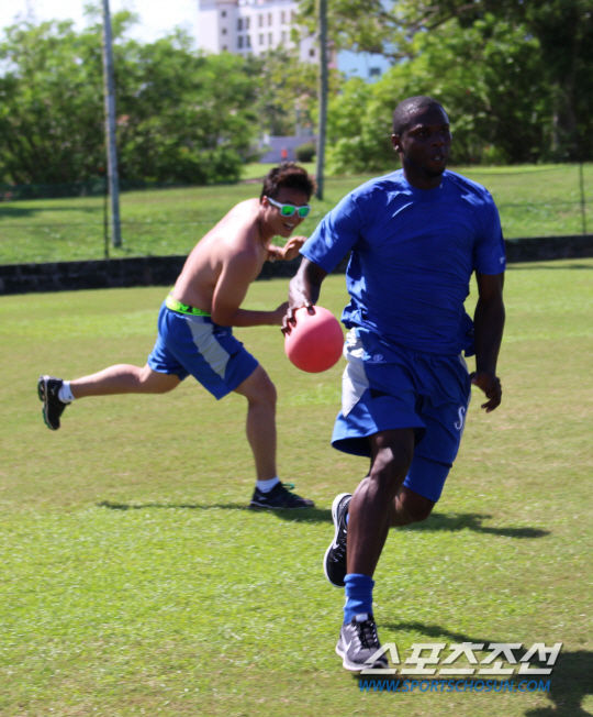 삼성 외국인 투수 피가로가 27일 괌 레오팔레스리조트에서 계속된 전지훈련에서 공뺏기 시합을 하는 도중 상대편 안지만의 태클을 피해 달려나가고 있다. 뒤의 안지만은 허탈한 웃음을 짓고 있다. 삼성은 1차 전훈지인 괌에서 2월 1일까지 체력과 전술 훈련을 할 예정이다. 2월 2일 일시 귀국해 가족과 하루를 쉰 후 2월 4일 다시 2차 전훈지인 일본 오키나와로 재출국한다. 선수단은 3월 4일 귀국할 예정이다. 괌=권인하 기자 indyk@sportschosun.com