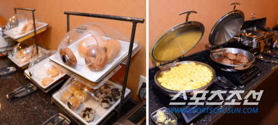 두산의 아침식사 메뉴. 선수들은 빵과 스크램블 에그, 시리얼 등으로 간단히 식사를 마친다.