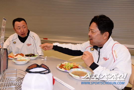 '화기애애' LG 양상문 감독과 차명석 코치(왼쪽)가 점심식사를 함께 하고 있다.
