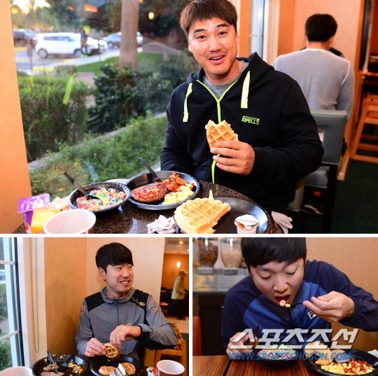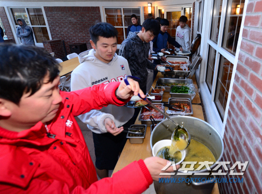 두산의 아침식사 메뉴는 의외로 소박하다. 네다섯 종류의 빵과 와플, 시리얼, 스크램블 에그, 소시지 등이 아침식사의 주메뉴. 메뉴 자체도 단출한 데다 식사량 역시 운동선수 치고는 많지 않은 편이다. 강도 높은 오전 훈련을 소화하기 위해선 과식은 금물이다.
