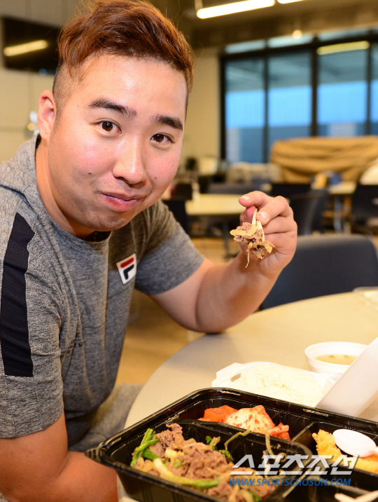 "불고기 홍보대사 해도 되겠죠?" 두산 유희관 선수가 점심식사 도중 불고기를 들어 올리며 웃음 짓고 있다.