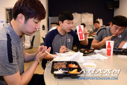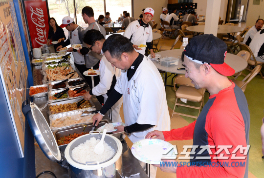 LG 선수들이 오전훈련을 마친 뒤 점심식사를 하고 있다. 선수들에게 특히 인기 있는 메뉴는 부대찌개, 떡볶이, 스파이시 치킨 등이다. 물론 밥과 김치는 빠질 수 없다.