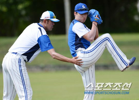 삼성 선수들이 괌 전훈 5일째 훈련을 했다. 20일 괌 레오팰리스 리조트 훈련장에서 삼성 선수들이 뜨거운 태양 아래서 구슬땀을 흘렸다. 카도쿠라 코치가 롱토스를 하고 있는 차우찬의 자세를 잡아주고 있다.