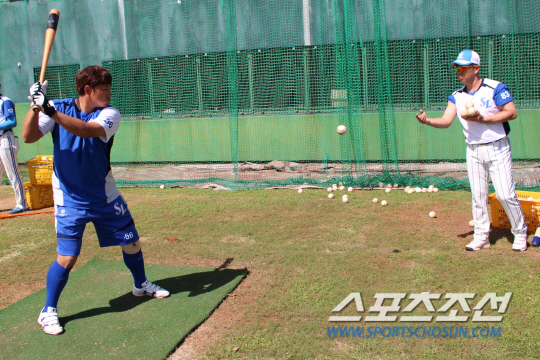 삼성 라이온즈 포수 이지영이 27일 괌 레오팔레스리조트에서 계속된 전지훈련서 강성우 배터리코치와 티배팅 훈련을 하고 있다. 삼성은 1차 전훈지인 괌에서 2월 1일까지 체력과 전술 훈련을 할 예정이다. 2월 2일 일시 귀국해 가족과 하루를 쉰 후 2월 4일 다시 2차 전훈지인 일본 오키나와로 재출국한다. 선수단은 3월 4일 귀국할 예정이다. 괌=권인하 기자 indyk@sportschosun.com