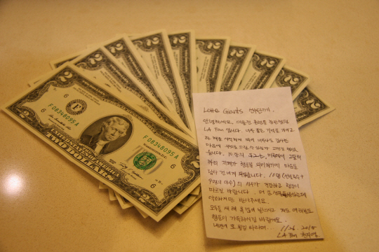 미국 에리조나에 스프링캠프를 차린 롯데 자이언츠 선수단에 반가운 손님이 왔다. 한 현지 팬이 행운의 2달러 선물을 전해 선수단 분위기가 밝아졌다.