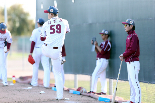 김정훈의 불펜피칭을 유심히 지켜보고 있는 넥센 히어로즈 염경엽 감독. 사진제공=넥센히어로즈