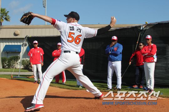 켈리도 마찬가지다. 메이저리그에서 던진 적 없다는 이유만으로 그를 평가할 수는 없다. 그러나 스프링캠프 스타트는 괜찮은 편이다. 켈리는 3일(이하 한국시각) 팀 합류 이후 첫 불펜 피칭을 실시했다. 켈리는 이날 미국 플로리다주 베로비치 히스토릭 다저타운에 마련된 전훈 캠프에서 실전에 가까운 힘을 실어 총 19개의 공을 던졌다. 김용희 감독과 김상진 투수코치가 지켜봤다.