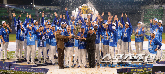 2014 프로야구 한국시리즈 6차전 삼성라이온즈와 넥센히어로즈의 경기가 11일 잠실야구장에서 열렸다. 4년연속 한국시리즈 우승을 차지한 류중일 감독과 삼성선수들이 트로피를 들고 환호하고 있다. 잠실=최문영 기자 deer@sportschosun.com /2014.11.11/