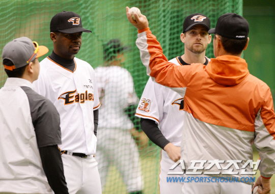 한화 이글스가 일본 고치의 시영구장과 동부구장에서 2015 스프링캠프를 펼치고 있다. 26일 고치의 시영구장에서 진행된 훈련에서 유먼과 탈보트가 김성근 감독과 이야기를 나누고 있다. 한화는 2015 전지훈련을 3월 3일까지 48일 동안 일본 고치와 오키나와에서 실시한다. 김성근 감독을 포함한 코칭스태프 23명과 주장 김태균을 포함해 선수 46명, 총 69명의 한화 이글스 선수단은 고치 시영구장과 동부구장에서 전지훈련을 진행한 후 2월15일 일본 오키나와로 이동해 고친다 구장에서 3월3일까지 전지훈련을 진행한다. 고치(일본)=허상욱 기자 wook@sportschosun.com/2015.01.26/