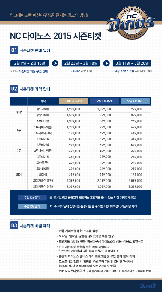 2015년 시즌티켓은 티켓링크(www.ticketlink.co.kr)에서 살 수 있으며, 문의는 NC 다이노스 마케팅팀 (055-608-8265)으로 가능하다.