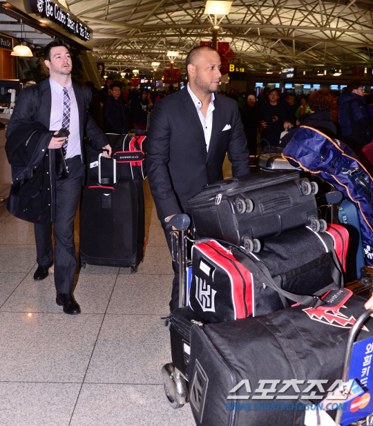 16일 오전 인천국제공항에서 KT가 일본 미야자키로 전지훈련을 떠났다. KT 앤디 마르테(오른쪽)와 어윈이 출국장으로 향하고 있다. 인천공항=김경민 기자 kyungmin@sportschosun.com / 2015.01.16.