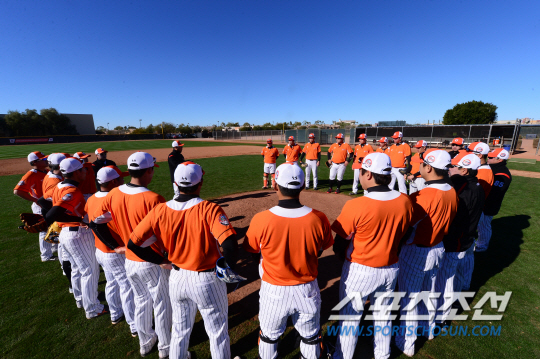 롯데 자이언츠가 미국 애리조나 피닉스 피오리아 스프링캠프에서 전지훈련을 펼쳤다. 롯데 애리조나 캠프는 코칭스태프와 선수단 60명으로 구성되어 2월12일까지 훈련을 한 후 일본 가고시마 캠프로 이동한다. 전술 훈련을 앞두고 마운드에서 미팅을 갖고 있는 선수들. 피오리아(미국 애리조나) 송정헌 기자 songs@sportschosun.com/2015.01.25