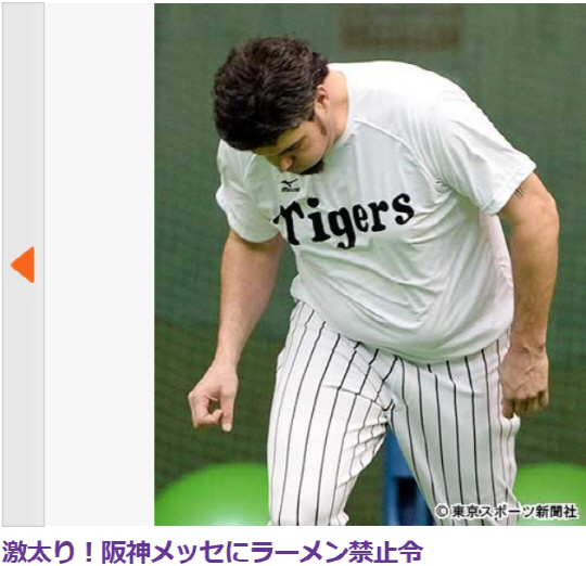 한신 관계자는 53개의 불펜피칭을 마친 뒤 늘어진 뱃살과 턱살 위의 수염을 고르는 메신저를 향해 "최소한 130㎏은 돼 보인다. 근육으로 몸이 커지는 것은 좋지만 메신저의 경우 대부분 지방이다. 이대로는 투구에 영향을 미칠 것이 분명하다. 올해도 풀시즌 활약을 해줘야 하는 상황이다. 전지훈련에서 어떻게든 다이어트를 감행할 것"이라고 말했다. 한신 구단은 지난해 208⅓이닝을 소화한 메신저에 대해 1월까지 휴식을 줬다. 이 기간 집중적으로 체중이 불어난 것으로 알려졌다. 메신저는 고칼로리에 나트륨이 많은 라면을 즐기는 데 오키나와 캠프에서도 점심으로는 주로 라면을 먹고 있다고.