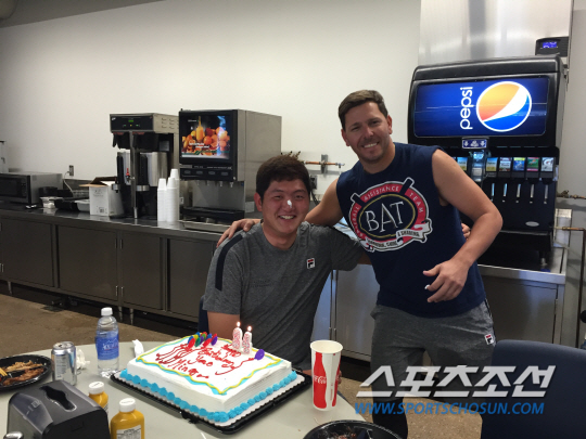 | 두산 외국인 투수 유네스키 마야. 지난해 한국야구의 적응기를 거쳤던 그는 올 시즌이 더욱 기대되는 선수다. 선수단과도 스스럼없이 어울린다. 팀동료 장민익의 생일을 위해 케?揚 챙긴 마야, 장민익과 마야의 손가락에 '어색한' 생일빵(?)의 흔적이 남아있다. 사진제공=두산 베어스 |