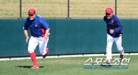| 11일 오전 일본 오키나와 킨쵸 베이스볼 스타디움에서 KIA 타이거즈의 훈련이 열렸다.KIA 김기태 감독(오른쪽)이 나지완과 달리기 시합을 하고 있다.오키나와(일본)=김경민 기자 kyungmin@sportschosun.com / 2015.02.10. |