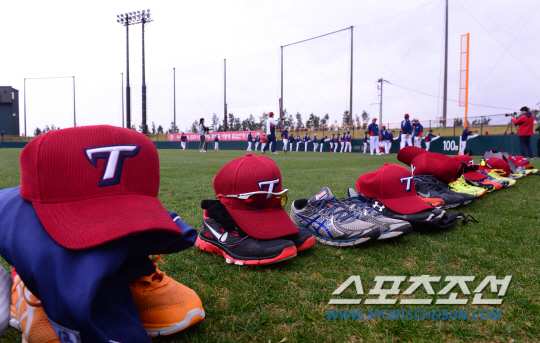 | 12일 오전 일본 오키나와 킨쵸 베이스볼 스타디움에서 KIA 타이거즈의 훈련이 열렸다. KIA 선수들이 외야에서 몸을 풀고 있는 가운데 모자와 신발들이 가지런히 놓여 있다. 오키나와(일본)=김경민 기자 kyungmin@sportschosun.com / 2015.02.12. |