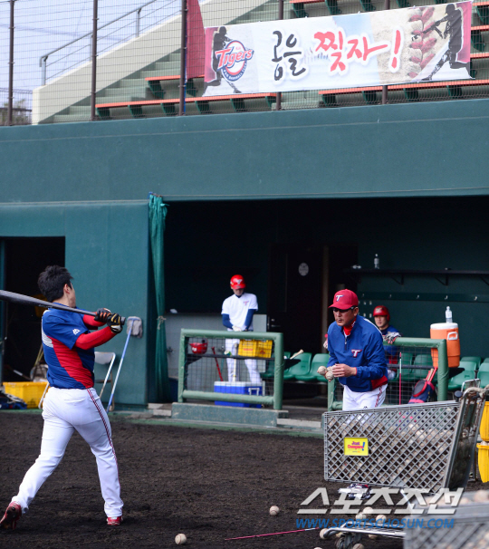 | 12일 오전 일본 오키나와 킨쵸 베이스볼 스타디움에서 KIA 타이거즈의 훈련이 열렸다.KIA 김기태 감독이 배팅볼을 던져주고 있다.오키나와(일본)=김경민 기자 kyungmin@sportschosun.com / 2015.02.12. |