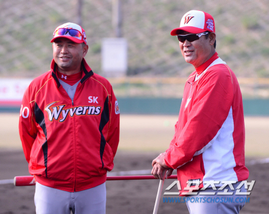14일 일본 오키나와 구시가와 야구장에서 SK 와이번스의 훈련이 열렸다. SK 김용희 감독과 김경기 수석코치가 이야기를 나누고 있다. 미국 플로리다에서 열린 1차 전지훈련을 마치고 지난 10일 귀국한 SK는 하루 휴식을 취한 뒤 12일(오늘) 2차 캠프가 열리는 일본 오키나와에 도착했다. 체력과 자발적 훈련에 방점이 찍힌 1차 전지훈련 성과에 대해 만족감을 표시한 김용희 감독은 2차 캠프에서 실전감각을 끌어올리며 시즌에 대비한다는 계획이다. 오는 SK는 16일 야쿠르트와의 경기를 시작으로 내달 1일 넥센과의 경기까지 총 9차례의 연습경기를 치른다. 오키나와(일본)=김경민 기자 kyungmin@sportschosun.com / 2015.02.14. |