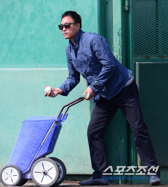 | KBS N 스포츠 송진우 해설위원이 SK 와이번스 캠프에서 취재 도중 떨어진 공을 줍고 있다. 오키나와=김경민 기자 kyungmin@sportschosun.com |