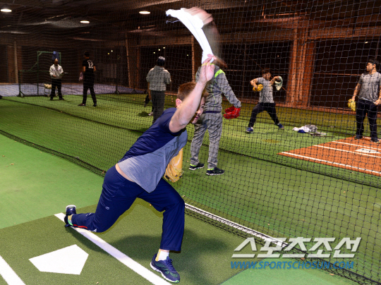두산 베어스 선수단이 미국 애리조나 피오리아 스포츠 콤플렉스에서 전지훈련을 실시 했다. 두산은 1월 16일- 2월 16일까지는 미국 애리조나 피닉스 피오리아에서 1차 캠프를 진행한다. 두산 선수들이 야간 훈련을 펼쳤다. 노경은이 수건을 이용한 쉐도우 피칭 연습을 하고 있다. 피오리아(미국 애리조나)송정헌 기자 songs@sportschosun.com/2015.01.22