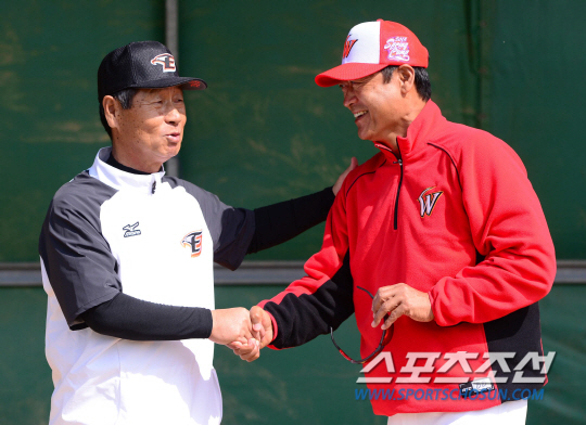 | 17일 일본 오키나와 고친다 구장에서 열린 한화 이글스와 SK 와이번스의 연습경기에 앞서 김성근 감독과 김용희 감독이 인사를 나누고 있다. 오키나와(일본)=김경민 기자 kyungmin@sportschosun.com / 2015.02.17. |