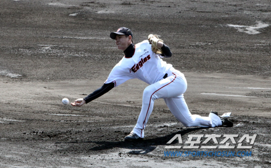 | ◇한화 이글스 언더핸드 투수 정대훈이 17일 일본 오키나와 고친다구장에서 열린 SK 와이번스와의 연습경기에 선발 등판해 역투하고 있다. 정대훈은 이날 3이닝 무안타 1사구 1삼진 무실점으로 호투해 경기 후 김성근 감독으로부터 유일하게 칭찬을 받았다. 한화는 이날 0대7로 완봉패했다. 사진제공=한화 이글스 |