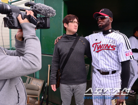 LG 소사가 김선우 해설위원과 반갑게 인사를 나누고 있다.