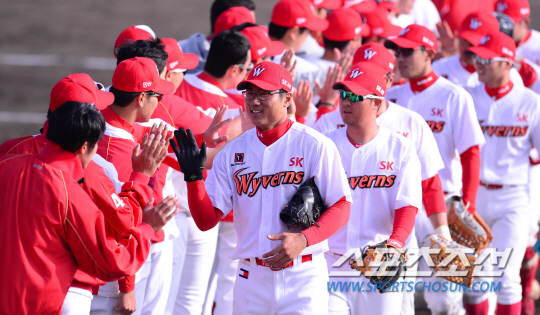 17일 일본 오키나와 고친다 구장에서 한화 이글스와 SK 와이번스의 연습경기가 열렸다. 7대0으로 승리한 SK 선수들이 하이파이브를 나누고 있다. 오키나와(일본)=김경민 기자 kyungmin@sportschosun.com / 2015.02.17.