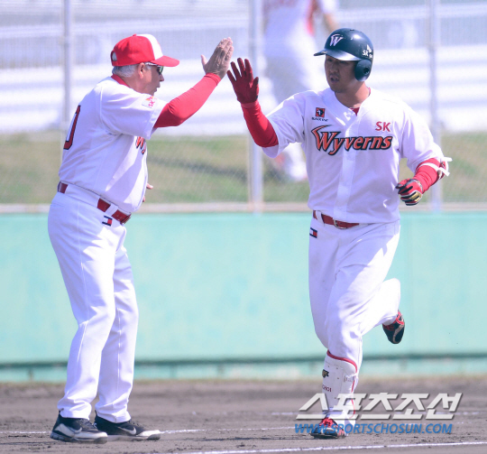 20일 오후 일본 오키나와 구시가와 야구장에서 LG와 SK의 연습경기가 열렸다. 1회말 SK 최정이 좌중월 솔로홈런을 친 후 알바레즈 코치와 하아피이브를 나누고 있다. 오키나와(일본)=김경민 기자 kyungmin@sportschosun.com / 2015.02.20.