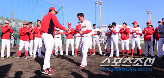 20일 오후 일본 오키나와 구시가와 야구장에서 LG와 SK의 연습경기가 열렸다. LG에 8대7로 승리하며 수훈선수로 선정된 SK 최정이 김용희 감독에게 상금을 받고 있다. 오키나와(일본)=김경민 기자 kyungmin@sportschosun.com / 2015.02.20.