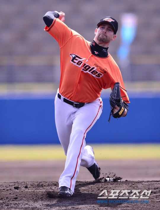 | 21일 오후 일본 오키나와 아카마 구장에서 한화와 삼성의 연습경기가 열렸다. 한화 탈보트가 힘차게 볼을 던지고 있다. 오키나와(일본)=김경민 기자 kyungmin@sportschosun.com / 2015.02.21. |