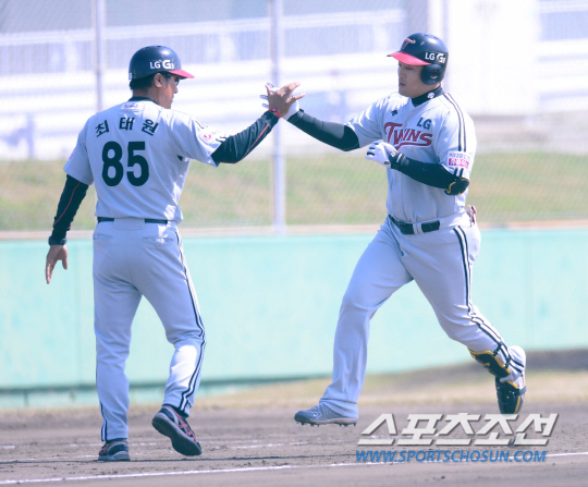 1회초 1사서 1,3루서 LG 정의윤이 좌중월 3점 홈런을 친 후 최태원 코치와 하이파이브를 나누고 있다. 오키나와(일본)=김경민 기자 kyungmin@sportschosun.com / 2015.02.20.