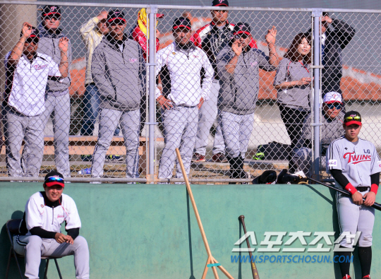 LG 박용택(왼쪽부터), 이병규, 최경철이 연습경기를 지켜보고 있다.
