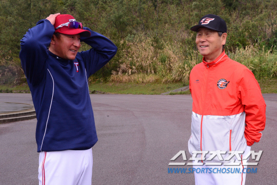 | 16일 일본 오키나와 고친다 구장에서 한화 이글스의 훈련이 열렸다. 한화 훈련장을 찾은 KIA 김기태 감독이 김성근 감독에게 인사하고 있다. 오키나와(일본)=김경민 기자 kyungmin@sportschosun.com / 2015.02.16. |