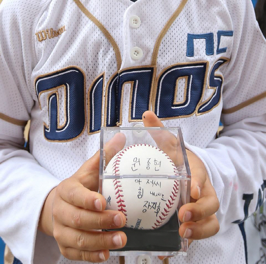 지난 23일(한국시각) NC다이노스의 LA전지훈련 캠프로 한 어린이팬이 찾아왔다. 대장암 수술후 회복중인 '원종현 아저씨'께 전달해 달라며 고사리 손으로 소원을 적은 야구공 편지를 내밀었다. 야구공엔 '원종현 아저씨 힘내세요'라고 씌어있었다. NC구단은 '작지만 강한 힘을 함께 나눕니다. Won Team, One Dinos'라며 감격스러워했다.