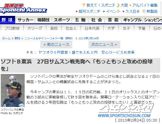 소프트뱅크의 히가시하마가 27일 삼성전에 등판한다는 스포츠닛폰 기사. 사진=스포츠닛폰 홈페이지 캡쳐