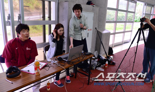 23일 일본 오키나와 구시가와 구장에서 넥센 히어로즈의 훈련이 열렸다. 넥센 구단 직원들이 인터넷 생중계 도중 홍원기 코치를 인터뷰하고 있다. 오키나와(일본)=김경민 기자 kyungmin@sportschosun.com / 2015.02.23.
