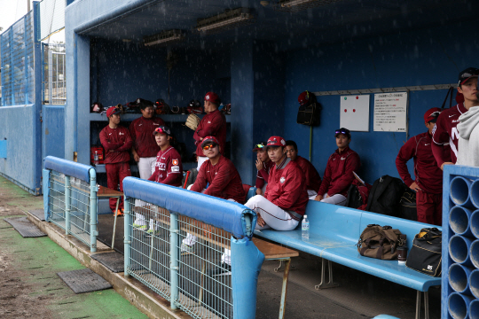 넥센 히어로즈 선수단이 24일 오키나와 온나손 아카마구장에서 삼성 라이온즈와의 연습경기가 열리기 직전 쏟아지는비를 바라보고 있다. 사진제공=넥센히어로즈