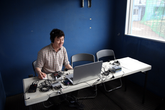 넥센 히어로즈 마케팅팀 임중홍 사원이 24일 오키나와 온나손 아카마구장에서 열릴 예정이던 삼성 라이온즈와의 연습경기에 앞서 자체 중계 방송 준비를 하고 있다. 사진제공=넥센히어로즈