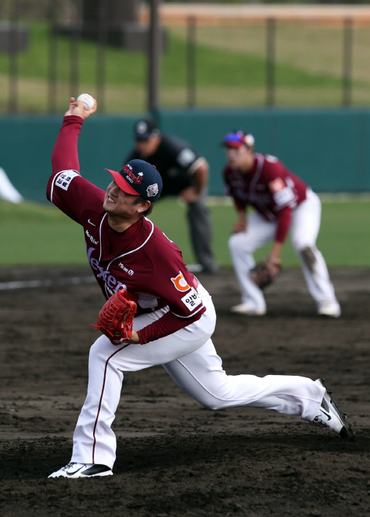 넥센 히어로즈 마무리투수 손승락이 25일 일본 오키나와 긴스타디움에서 열린 KIA 타이거즈와의 연습경기에 9회말 등판해 역투하고 있다. 손승락의 바뀐 투구폼이 눈에 띄었다. 사진제공=넥센히어로즈