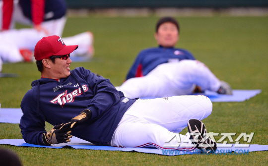 12일 오전 일본 오키나와 킨쵸 베이스볼 스타디움에서 KIA 타이거즈의 훈련이 열렸다. KIA 김주찬이 몸을 풀고 있다. 오키나와(일본)=김경민 기자 kyungmin@sportschosun.com / 2015.02.12.