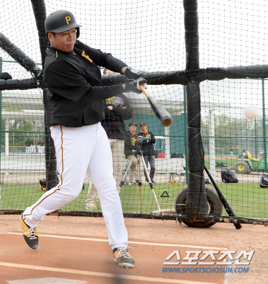 피츠버그 파이어리츠의 강정호가 28일(한국시간) 미국 플로리다 주 브래든턴의 파이어리츠 시티에서 펼쳐지고 있는 팀의 공식훈련에 참가해 구슬땀을 흘렸다. 흐린 하늘과 바람이 불었던 훈련하기엔 약간 쌀쌀한 날씨였지만 강정호는 날카로운 스윙을 선보이며 클린트 허들 감독이 "나이스!"를 외치게 했다.