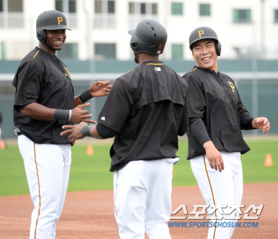 피츠버그 파이어리츠의 강정호가 1일(한국시간) 미국 플로리다 주 브래든턴의 파이어리츠 시티에서 펼쳐지고 있는 팀의 공식훈련에 참가해 구슬땀을 흘렸다. 강정호가 스털링 마르테, 그레고리 폴랑코, 코리 하트와 주루훈련을 하며 밝은 미소로 이야기를 나누고 있다.